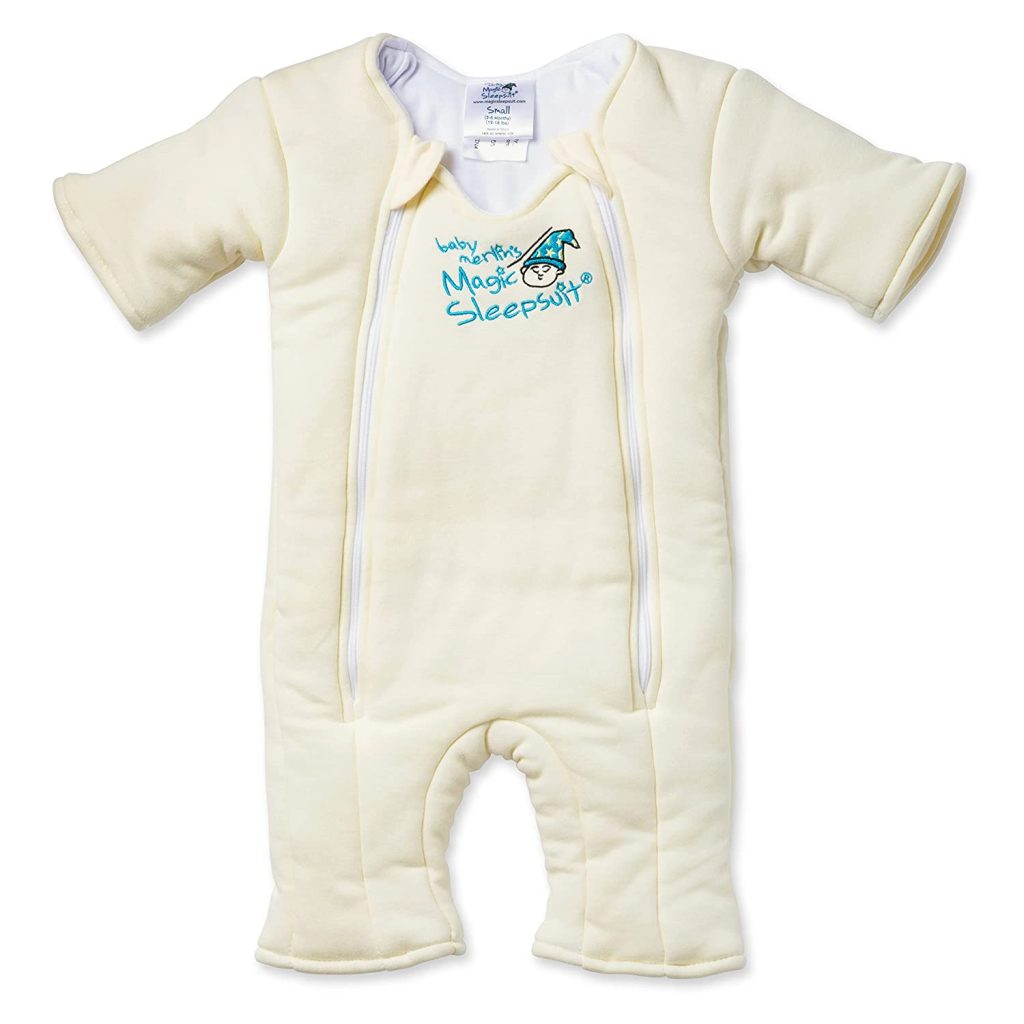 The Baby Merlin’s Magic Sleepsuit is the original swaddle transition product that helps establish healthy and restful sleep habits for babies. The two-piece sleepsuit is made with soft, breathable jersey cotton and a cozy microfleece material that provides warmth and comfort for babies aged 3-6 months. Between these layers is a layer of polyfil which gives just the right amount of cushioning and ease while the baby sleeps.
